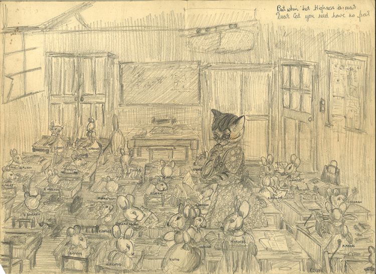 This intriguing drawing was discovered among records of Greenfield School, Woking, recently deposited before the school’s merger with Hoe Bridge School (10768/1/2/2). The pencil sketch, depicting a cat teacher with a classroom of mice pupils, is captioned, ‘But when her Highness is near, Dear Cat you need have no fear’.