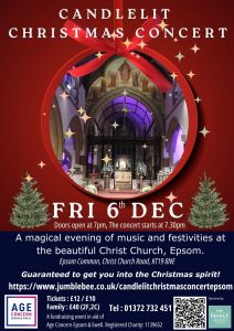 A magical evening of festive music & delicious treats. Songs by solo artists, duets and local choirs – gauranteed to get you into the Christmas spirit! An enjoyable evening for all the family in aid of Age Concern Epsom & Ewell