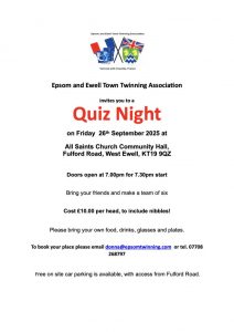 Epsom and Ewell Town Twinning Association is holding its annual fun-filled Quiz Night on Friday 26th September at All Saints Community Hall, Fulford Road, West Ewell, KT19 9QZ.