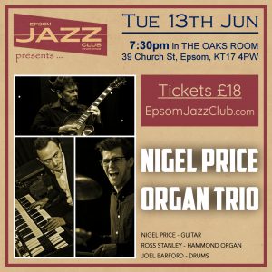 Epsom Jazz Club celebrates its 1st Birthday with an evening of top quality jazz from Epsom’s very own Nigel Price. Sharing the stage with guitarist Nigel will be his highly-regarded A-list rhythm section of Ross Stanley (hammond organ) and Joel Barford (drums).