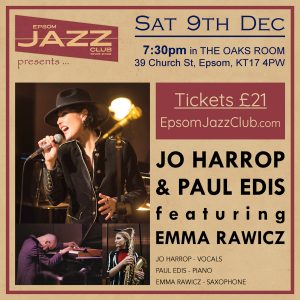 This very special show will feature a feast of festive favourites and jazzy Christmas classics performed by singer Jo Harrop and virtuoso pianist Paul Edis, who together recently won Album Of The Year at the 2023 Parliamentary Jazz Awards for their critically acclaimed long-player “When Winter Turns To Spring”. They will be joined by rising saxophone star, and previous Epsom Jazz Club headliner, Emma Rawicz.