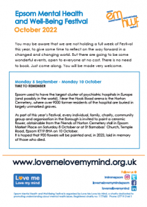 As part of this year’s Festival, every individual, family, charity, community group and organisation in the Borough is invited to paint a ceramic flower, obtainable from the Friends of Horton Cemetery stall in Epsom Market Place on Saturday 8 October or at St Barnabas’ Church, Temple Road, Epsom KT19 8HA on 10 October. It is hoped that 900 flowers will be painted and, in 2023, laid in memory of those who died.