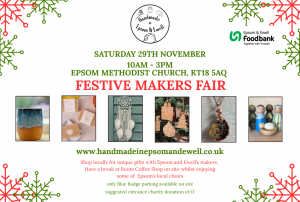 A new Community Xmas event for Epsom bringing together makers from only Epsom and Ewell whilst also raising money for a local charity. 22 makers will be selling their high quality crafts ranging from honey to ceramics, wood turning to felting. In addition there will be local choirs singing in Roots Cafe which will be open for the event in the church. Funds from the event will be donated to Epsom Food Bank. Entry donations will be given to them and the event will serve as a drop off for donations for their Xmas appeal. HIEE is organised by four local established makers who are working on a voluntary basis.