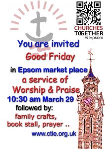 Come, with your friends and neighbours, to an open-air ecumenical Good Friday Service of Worship and Praise next to the Clock Tower in Epsom: 10:30am, March 29th, organised by Churches Together in Epsom. This will be followed by Easter-themed activities for the whole family. You are invited.