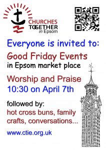 Come, with your friends and neighbours, to an open-air ecumenical Good Friday Service of Worship and Praise next to the Clock Tower in Epsom: 10:30am, April 7th, organised by Churches Together in Epsom. This will be followed by Easter-themed activities for the whole family. All are invited.