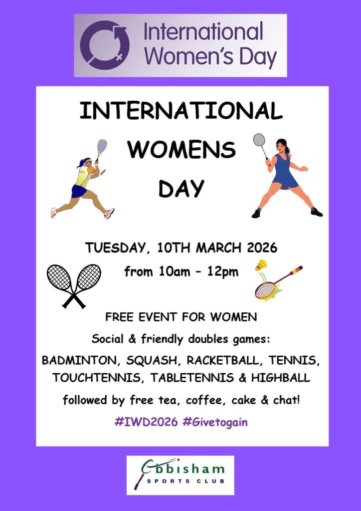Free event for Women. Ebbisham Sports Club, come and play social and friendly badminton, squash, racketball, tennis, touch tennis, table tennis and High Ball. Followed by free tea, coffee, cake and chat.