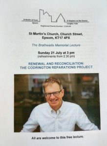 A free talk, with questions and discussion, by Revd Dr Duncan Dormor, General Secretary of USPG, on their Renewal and Reconciliation project working in partnership with the descendants of the enslaved of the Codrington Estate in Barbados. John Brathwaite, who is buried at St Martin’s Church and is memorialised there, was involved in the running of that Estate. He lived in Epsom with his niece Mary Ashley, one of the beneficiaries of his will, in the house which became known as Ashley House, and led to the naming of Ashley Road, and the Ashley Centre. Refreshments from 2.30 pm.