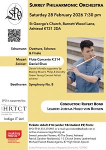 “The Surrey Philharmonia’s first concert of the year will take place on Saturday, 28th February, at St George’s church, Ashtead. It features Mozart’s flute concerto with award winning soloist Daniel Shao. Adapted, by Mozart, from an original oboe concerto, it is said to be an excellent showpiece for a modern virtuosic soloist.
