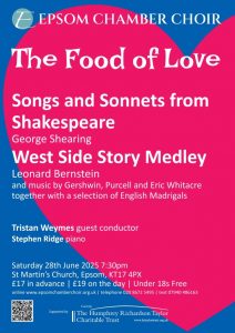 Epsom Chamber Choir’s summer concert, ‘The Food of Love’, is wholly inspired by the works of William Shakespeare. George Shearing’s uplifting Songs & Sonnets take centre stage along with a medley of music from Leonard Bernstein’s take on Romeo and Juliet – West Side Story. Well-known pieces by George Gershwin as well as a selection of English madrigals and pieces by Eric Whitacre and Finnish composer Mäntyjärvi complete the programme.