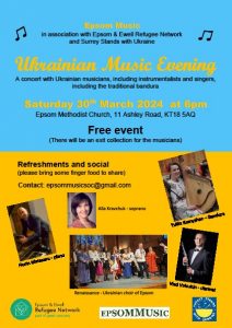 Come join friends and supporters of Epsom and Ewell’s Ukrainian guests in a wonderful evening of classical music and poetry performed by superb Ukrainians.